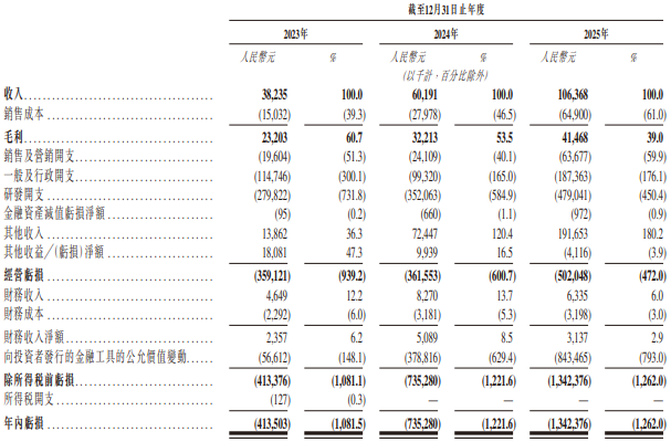 2023年、2024年、2025年,曦智科技的收入分别为38.2百万元、60.2百万元、106.4百万元;净亏损分别为413.5百万元、735.3百万元、1,342.4百万元。