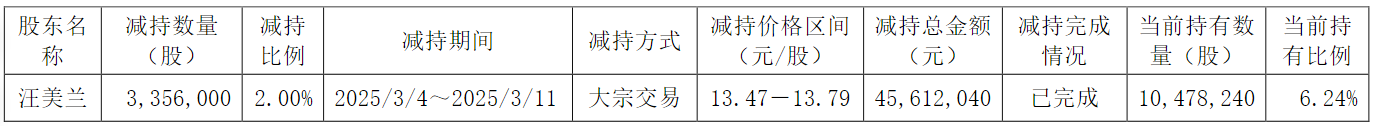2025年3月4日至2025年3月11日,汪美兰通过大宗交易方式减持公司股份3,356,000股,占公司总股本的2.00%,本次减持计划已实施完毕,减持总金额4561.20万元。