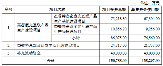 本次发行的募集资金总额(含发行费用)不超过138,297.00万元,扣除发行费用后,实际募集资金拟投资于高密度光互联产品生产建设项目、杰普特总部及研发中心升级建设项目、补充流动资金。