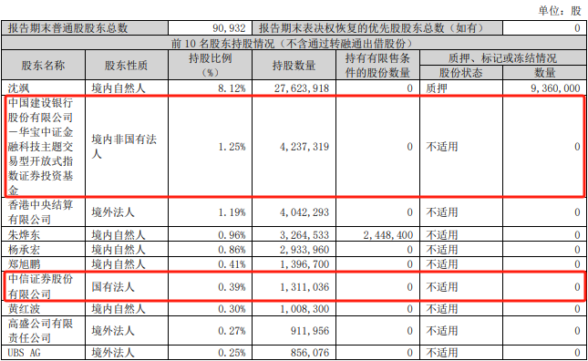 2026年一季度报告显示,截至2026年3月31日,公司的第二大股东为中国建设银行股份有限公司-华宝中证金融科技主题交易型开放式指数证券投资基金;第七大股东为中信证券股份有限公司。