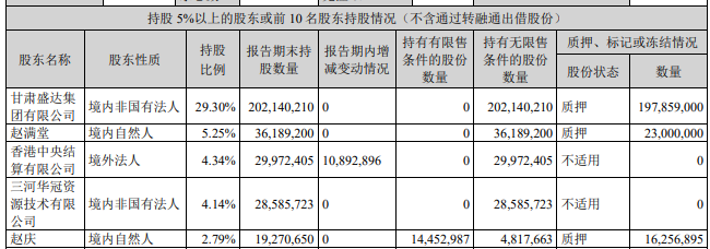 财报显示,公司控股股东或第一大股东及其一致行动人累计质押股份数量占其所持公司股份数量比例达到80%。其中,甘肃盛达集团有限公司质押1.98亿股,赵满堂质押2300万股,赵庆质押1625.69万股。