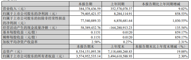 盛达资源2026年一季度报告显示,公司报告期内营业总收入为3.84亿元,同比增长9.02%;归属于上市公司股东的净利润为7940.54万元,同比增长858.53%;归属于上市公司股东的扣除非经常性损益的净利润为7754.09万元,同比增长1030.55%;经营活动产生的现金流量净额为5838.94万元。