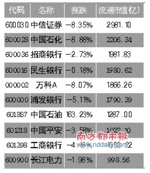 昨日,在中国石化的带领下,前10大流通市值股除首日上市的中石油外,无一上涨。分析人士认为,中国石油的上市,因其巨无霸式的权重,料将引发基金对权重股板块的调仓行为,从而构成较为沉重的抛压。