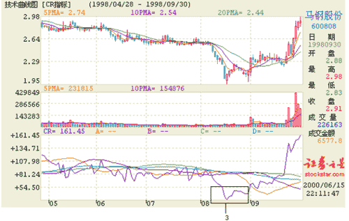 2、图表上须另外画出CR本身的10、20、40、62日移动平均线。