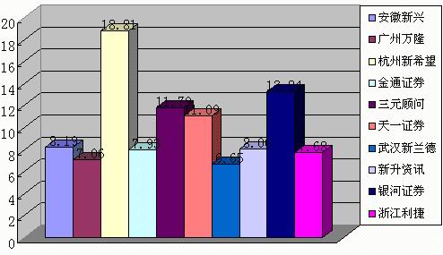 在市场重新活跃起来后,地产、航空、造纸、石化等等升值概念股全线启动,而中国石化最大涨幅超过6%的走势极大的影响了场外观望的资金,也进一步激发了炒作热情,可以说,目前人民币升值概念的炒作如火如荼,个股机会不断增加,从排行榜我们看到,机构荐股的力度也有所加大,众多新面孔也出现纷纷上榜。周排名显示,"杭州新希望"、"银行证券""三元顾问"排名三甲,其中三元顾问堪称短线英雄,以前连续五周上榜,上周共出击9只股票。杭州新希望这周上榜,位列第一,整体表现均不错,其推荐的浪潮软件单日涨幅10.04%,踩准了科技股反弹的步伐。 "三元顾问"周排名成绩同上周推荐的个股涨幅较高直接相关,同时也和该机构的一贯在机构推荐中排名靠前相关,而分析该机构的思路,无疑是短线游击思路的写照。银河证券可谓厚积薄发,本周再度荣耀步入三甲,其推荐虽然仅有的7只股票整体走势稳健均表现不差,平均每只上涨幅度均超过3%,成熟、稳健的操作风格得到集中体现。