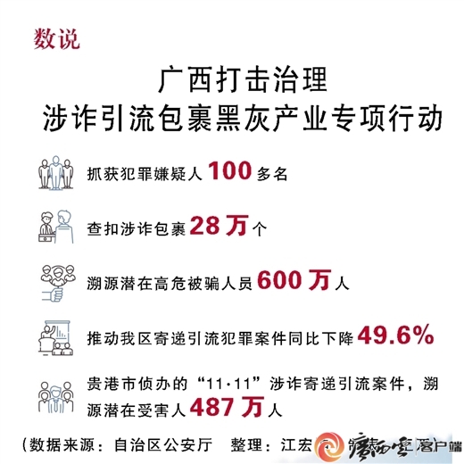 针对不法分子利用快递包裹实施诈骗的案件多发态势,我区公安机关联合邮政管理部门,今年3月启动了打击治理涉诈引流包裹黑灰产业专项行动,抓获犯罪嫌疑人百余名,查扣涉诈包裹28万个,溯源潜在高危被骗人员600万人,推动我区寄递引流犯罪案件同比下降49.6%。其中,贵港市侦办的“11·11”涉诈寄递引流案件,揭开了背后的诈骗生态链,在打击治理涉诈引流包裹黑灰产业方面取得丰硕成果。