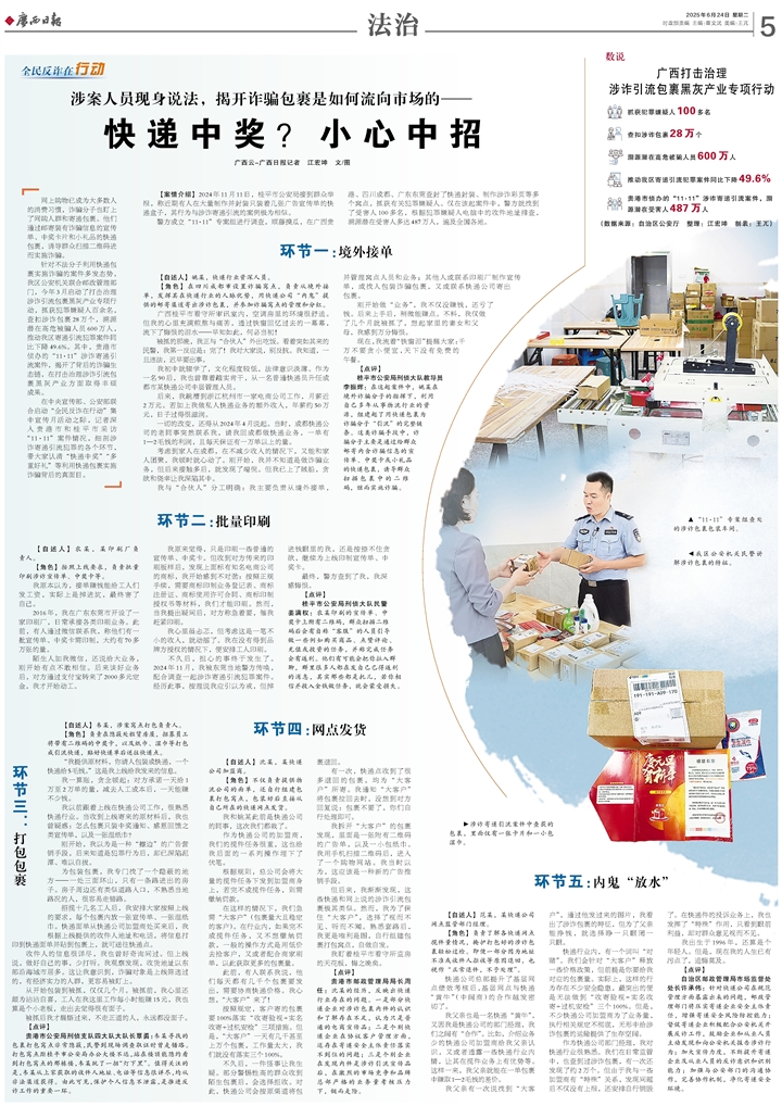 在中央宣传部、公安部联合启动“全民反诈在行动”集中宣传月活动之际,记者深入贵港市和桂平市采访“11·11”案件情况,细剖涉诈寄递引流犯罪的各个环节,带大家认清“快递中奖”“多重好礼”等利用快递包裹实施诈骗背后的真面目。
