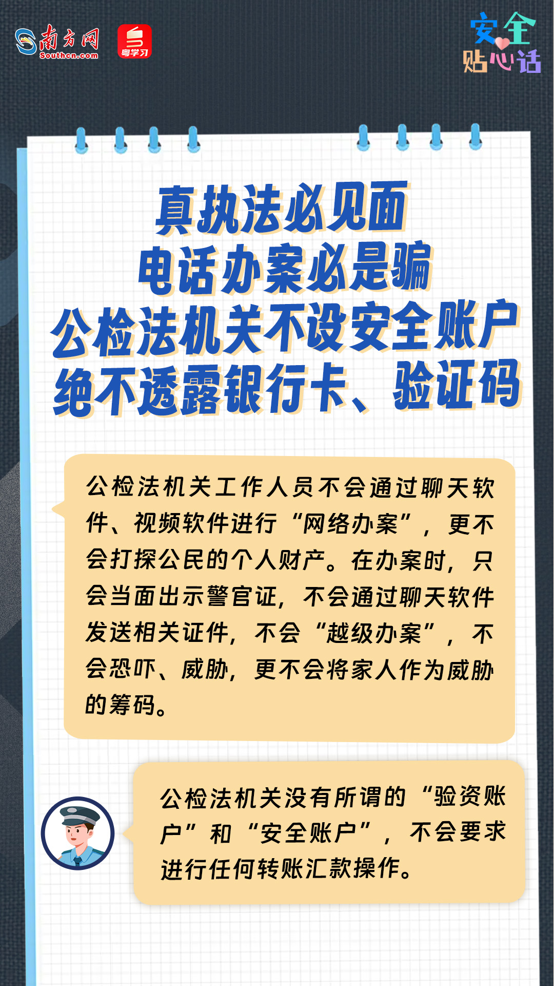 任何陌生电话、短信、网络信息提到钱、账户、转账、安全问题时,第一时间提高警惕。公检法不会通过电话、社交软件办案,更不会要求转账到“安全账户”。