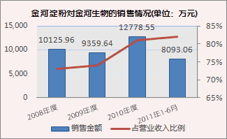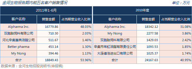 报告期内,美国Alpharma Inc.始终为金河生物第一大客户,销售占比远超其他客户。根据招股书,2008年、2009年、2010年和2011年1-6月,金河生物对Alpharma Inc.的销售金额分别为13,962.40万元、10,216.10万元、18,342.12万元和16,779.86万元,分别占当期营业收入31.43%、22.27%、31.08%和48.03%。 |