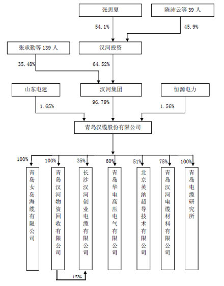 | 2007年,张思夏等人就成立了汉河投资。经过一番运作,2009年11月5日后,张思夏持有汉河投资54.10%的股权,汉河投资持有汉河集团64.52%的股权,汉河集团持有本公司96.79%的股权,张思夏通过控制汉河投资,间接控制汉河集团和青岛汉缆,张思夏实际持有青岛汉缆的比例达到33.78%。摘自:21cn |