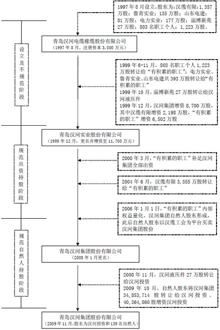 | 汉河集团的前身为青岛汉河电缆股份有限公司,成立于1997年8月,注册资本3000万元。当时股东的出资情况为:汉缆有限1357万股;鲁青实业135万股;山东电建81万股;青岛电力实业177万股;淄博新苑27万股;803名职工个人1223万股。 |