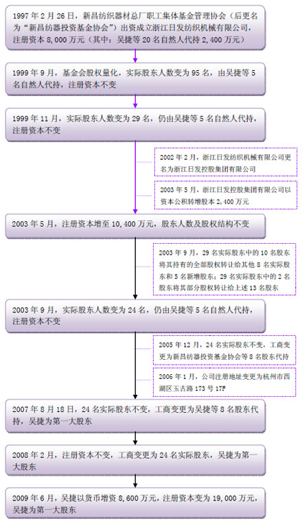 | 日发集团前身为浙江日发纺织机械有限公司,1997年由新昌纺织器材总厂职工集体基金管理协会(基金会前身,以下简称为“职工协会”)与以吴捷为代表的20名自然人出资成立。公司注册资本为10400万元,职工协会出资8000万元,吴捷等人出资2400万元。 |