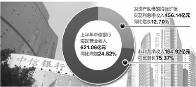 理财业务的良好表现,为中信银行经营效益持续提升提供了重要支撑。数据显示,今年上半年中信银行实现营业收入621.06亿元,同比增加24.52%。其中,因资产规模的持续扩张,公司实现利息净收入456.14亿元,同比增长12.70%;非利息净收入164.92亿元,同比增长75.37%。截至报告期末,中信银行资产总额达4.31万亿元,比上年末增长18.40%,贷款及垫款总额2.12万亿元,比上年末增长9.17%;客户存款总额3.05万亿元,比上年末增长15.14%。