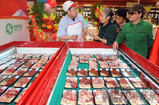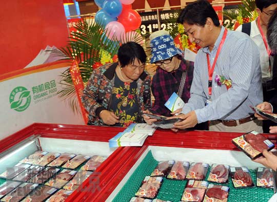 5月22日,甘南州副州长才智(右)向北京消费者介绍甘南牦牛肉。 当日,北京首家青藏高原牦牛肉专卖店在北京美廉美超市学清路店揭牌,来自甘肃省甘南藏族自治州的生态牦牛肉食品今后将端上首都市民餐桌。 甘南牦牛肉来自海拔3800米、有“亚洲第一天然优质牧场”美誉的玛曲县。牦牛是青藏高原特有物种,天然放养,其肉制品符合健康、安全、生态的消费需求。