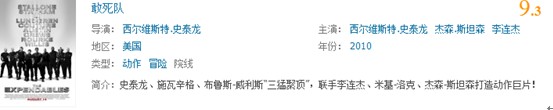 唐玮杰:强大。震撼。无论是阵容,还是画面。史泰龙,杰森.斯坦森,李连杰……个个都很给力,作品中至始至终都来的很紧凑,很高烧,很火爆,很强悍……虽然李在本剧中略逊几分,但依然不后悔他的存在,因为敢死队传达的就是一个队,一种团队精神,缺一不可。