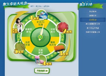 康王幸运大转盘有奖活动7月1日正式上线,8月31日截止,为期2个月,为消费者参与活动提供了充足的时间保障,康王相关负责人表示:康王不仅为广大消费者提供健康,更为消费者提供欢乐,轻轻点击鼠标转动转盘,幸运和快乐就会成为你这个夏天的关键词。