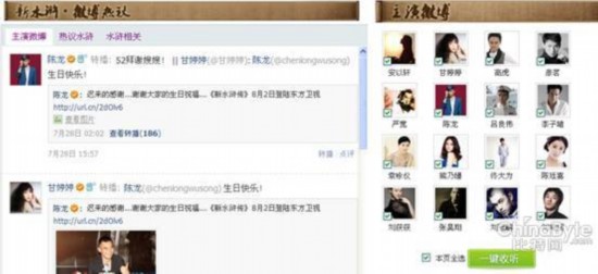 精细化运营亮点一:腾讯视频全平台互通基础上的社交化运营,8月1日,新《水浒》虽然尚未在腾讯视频播出,但是腾讯娱乐频道已经为其倾力打造专题页面,充分体现了腾讯视频全平台互通的构架,在页面建设上也延续视频内容同社交互动平台结合的结构,特别开辟新《水浒》微博热议版块,同时新《水浒》主要演员均开通腾讯微博,同网友近距离接触。截止目前,腾讯微博中同新水浒相关广播已接近五万条。